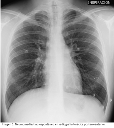 El neumomediastino espontáneo (NE) es una patología benigna e infrecuente que predomina en varones jóvenes adultos, desencadenada por cambios súbitos de presión intratorácica. Entre sus manifestaciones clínicas más frecuentes destacan dolor torácico, disnea y enfisema subcutáneo, las cuales pueden simular diferentes patologías cardiopulmonares con complicaciones más graves o con mayor índice de letalidad, por lo que en determinadas ocasiones el diagnóstico es difícil ya que se deben excluir en primera instancia las causas secundarias de neumomediastino.