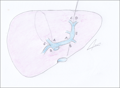 La técnica que utilizamos es el AGI descripto por Machado (9, 10). Consiste en el abordaje, clampeo y sección de los pedículos glissonianos intrahepáticos sin necesidad de maniobra de Pringle o maniobras digitales. Se realiza mediante pequeñas incisiones (“mini-hepatotomías”) en la cara inferior hepática, localizadas según repères anatómicos constantes para el pedículo glissoniano que se desea controlar (Figura 1).