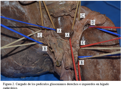 Results: in the 6 cadaveric livers it was possible to load all the Glissonian pedicles (lobar and sectoral bilaterally, as well as the left segmental ones). These are found at a depth of less than 2 cm from the hepatic capsule, being accessible for control by IGA. The main exception is the right anterior pedicle, whose origin is deeper, which, associated with its cephalad and sometimes branched origin, can make it more difficult to load. The application of the IGA was carried out in 5 patients, in all of them it was effective, it took little time and there were no intraoperative complications.