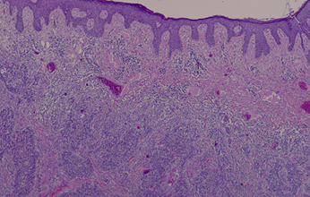 Tras un estudio completo sin hallar signos de recidiva loco regional ni a distancia, se tomó una biopsia la lesión confirmando carcinoma escamoso.